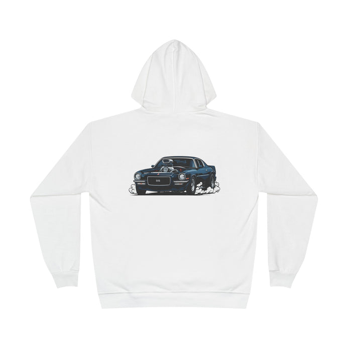 This mid-weight pullover hoodie brings calm confidence to weekend drives and late-night meetups. Soft fleece inside and a roomy kangaroo pocket make it easy to slip into comfort. Clean, minimal branding on the chest keeps the look understated, while the bold car illustration across the back speaks to a love of vintage power and tire-smoking thrills. It layers well over tees or under a jacket, and the tubular knit gives a smooth, modern silhouette that won’t box you in. Wear it to car runs, garage hangs, or when you just want to feel connected to the road and the people who know its sound.